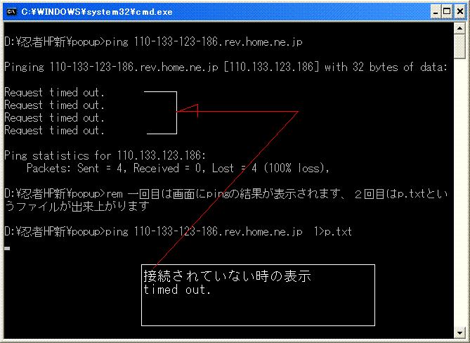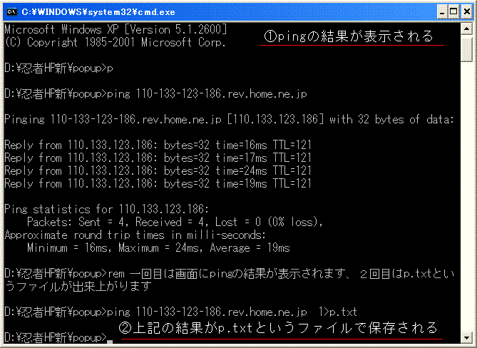 p.bat --pingコマンドを自動的に出した後、同じ動作を行い p.txt ファイルを生成する